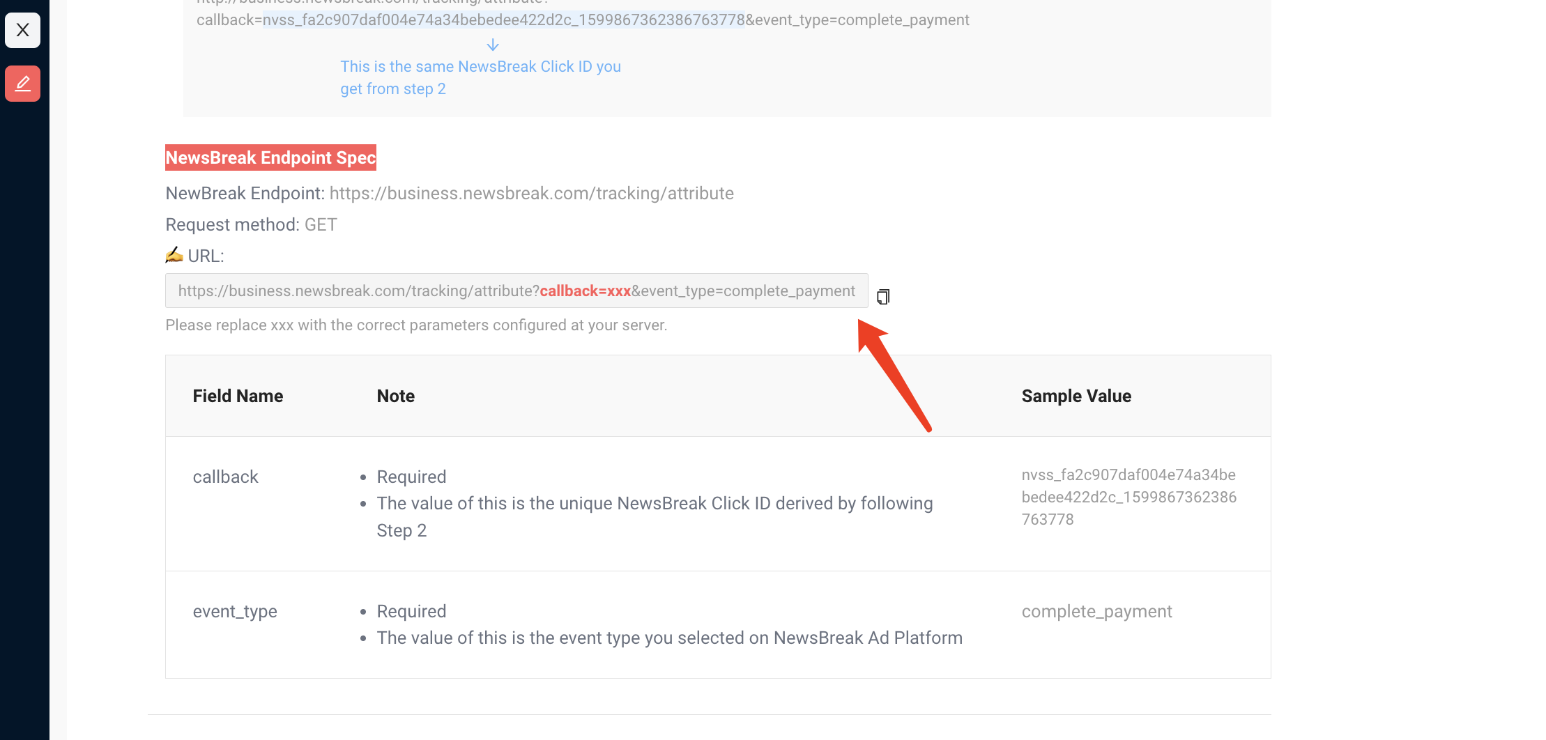 - Please make sure the callback parameter is correctly configured with your server to pass back the NewsBreak Click ID, and specify the event_type which is usually auto-generated based on your input (eg. "event_type=complete_payment"). If you turned on Event value, you'll also need to specify the event value in the nb_value parameter in the URL.