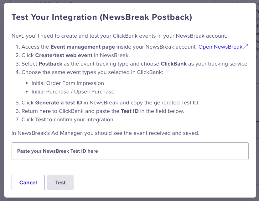 - Return to the ClickBank modal, paste the Test ID into the field provided, and click Test to verify the postback.
