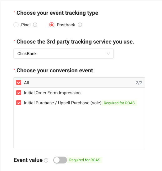 - Conversion events: Select the same options you chose in ClickBank (e.g., Initial Order Form Impression, Initial Purchase, Upsell Purchase).