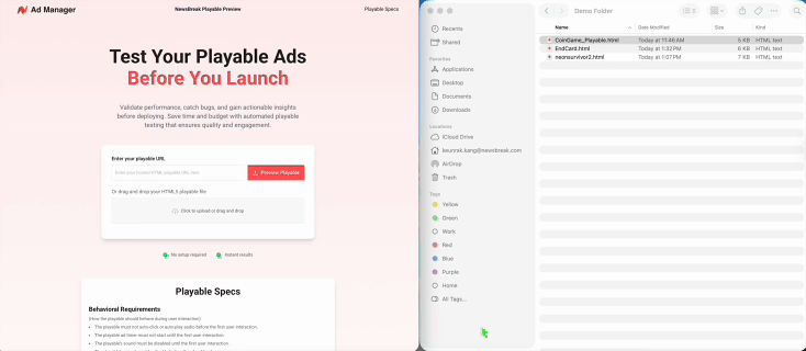 Playable ads must meet the following requirements:- Format: HTML5 (self-contained with base64-encoded assets)
