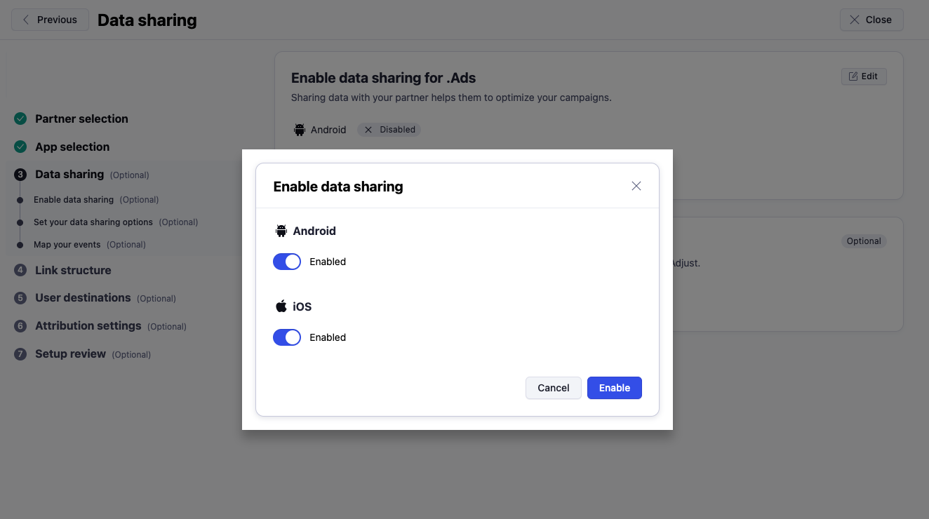 In the Data Sharing section of the partner settings, toggle the Enabled switch to ON. Once enabled, Adjust will automatically send NewsBreak all installs that are attributed to us.