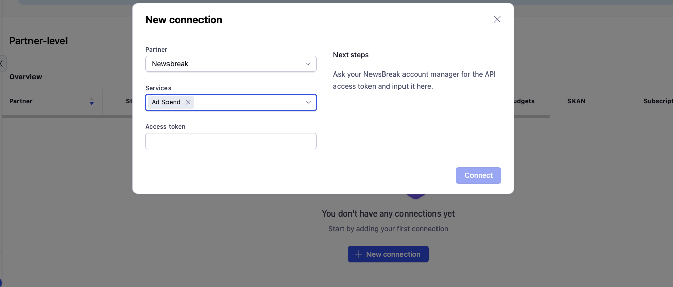 - Copy your Ad Manager API Access Token, enter it in the access token field, and select Connect.