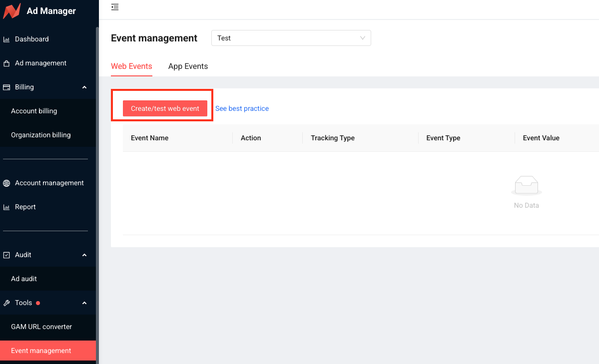 - Access the Event management page inside your NewsBreak Ad Manager account.