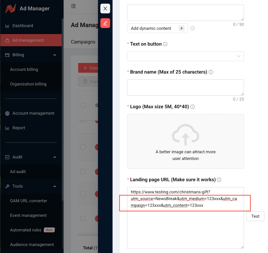 Step 8: Test the landing page url in NewsBreak Ad Manager